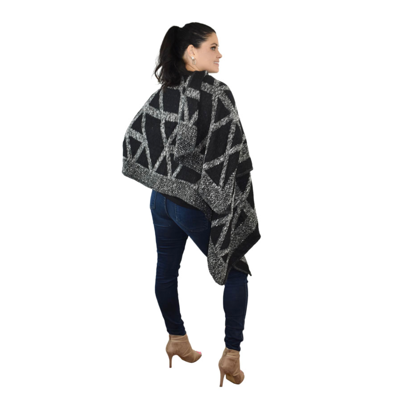 This reversible cotton blend wrap oh so inviting a soft fluffy texture that features a contemporary woven triangle design with a wide solid border that’s finished with a blanket stitch. Generously sized and perfectly cut for a beautiful drape, this blanket inspired scarf wrap is fully reversible for tons of function, versatility and style options.