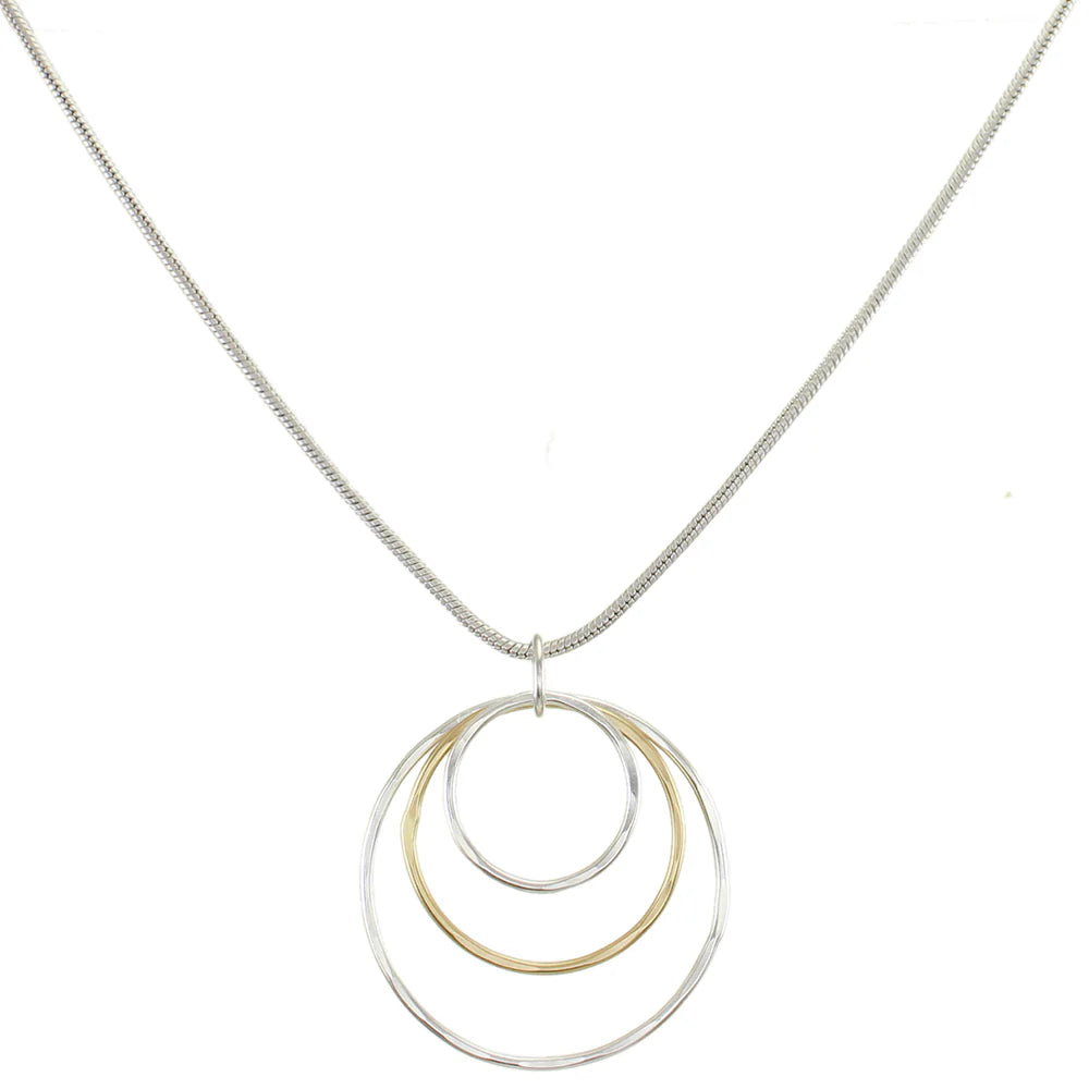 Three light and airy hammered rings in brass and silver - on silver snake chain.