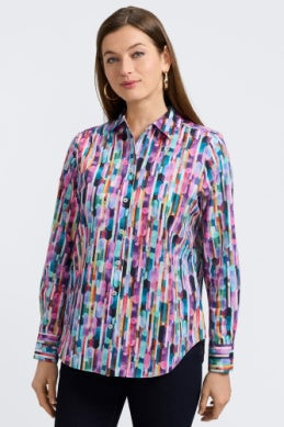 Margie turns up the volume in this bold, vibrant print — a kaleidoscope of color with serious style power. The classic button-up silhouette gets a modern refresh with crisp lines, vivid verticals, and a print that extends under the collar and cuffs. Long sleeves offer extra coverage, while the versatile fit moves seamlessly from polished to playful.• Regular fit.