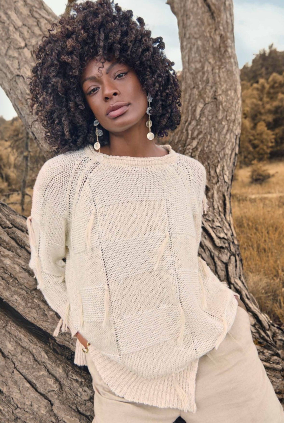 Take your sweater game to the next level with the NOEN PLAYFUL FRINGE PULLOVER. This cream-colored gem not only adds a fresh touch, but its warm and cozy fabric will keep you feeling snug. With its basket-weave design and quirky fringe details, this pullover is the ultimate blend of style and comfort. And let's be real, who wouldn't say yes to that?