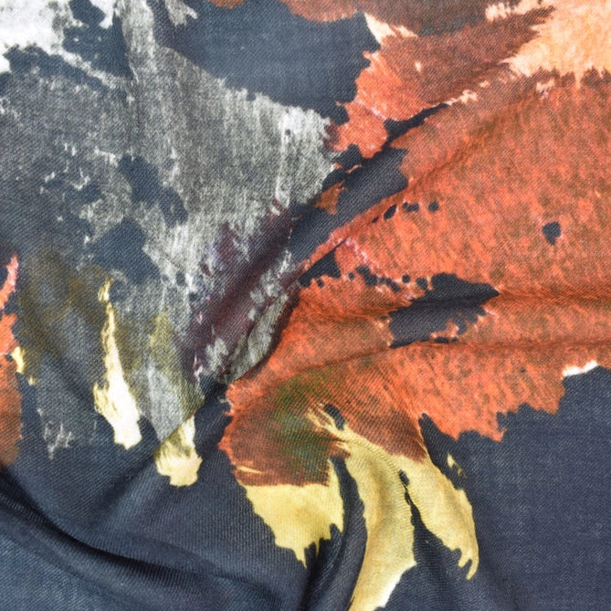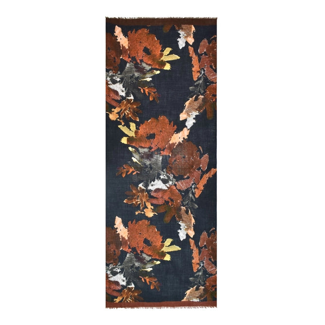 Against a sleek black backdrop, a painterly display of florals and leaves blossom. Solid color stripes grace the ends, adorned with delicate eyelash fringe for added texture and charm. Versatile and chic, it effortlessly elevates any ensemble, from casual outings to evening soirées. Embrace the season's rich hues with this timeless accessory. Size: 27.5" x 71" Fabric: 100% Twill Wool Care: Dry Clean Only Season: Fall/Winter