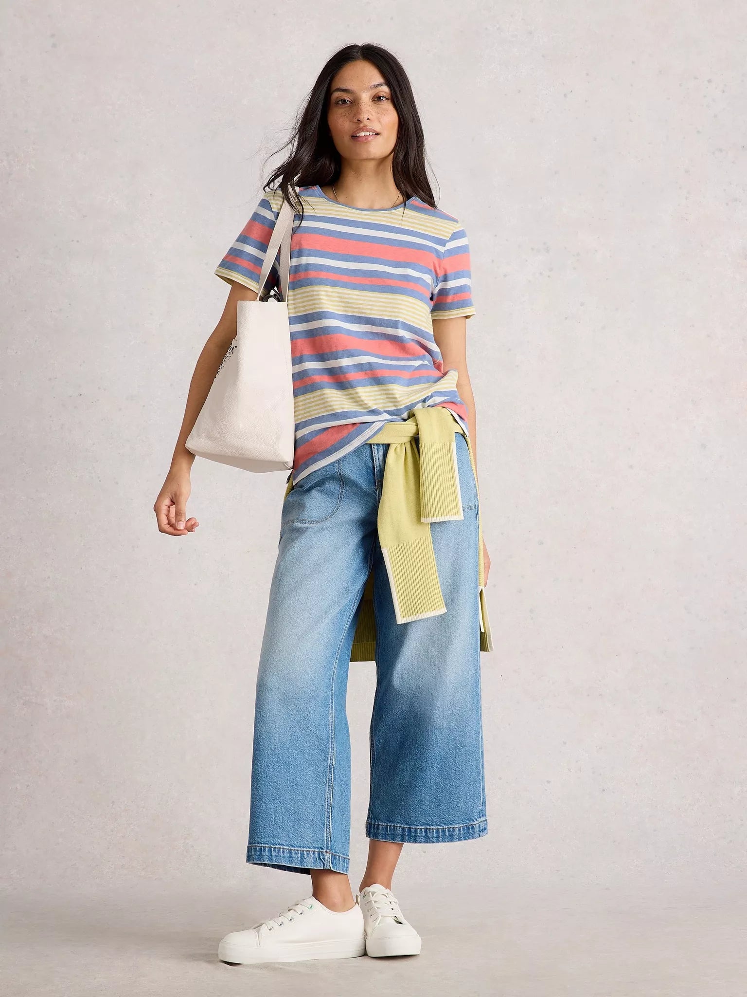 A crew neck tee with multicoloured stripes. We can picture the sunny picnics as we speak.
